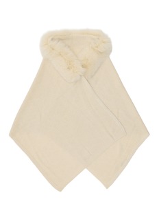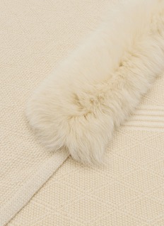 Lane’s knitted shawl channels a serene elegance through its ivory hue and tactile richness. Meticulously woven from wool and cashmere, the piece is adorned with a plush fox fur collar, exuding quiet sophistication—ideal for softening tailored outerwear or elevating après-dusk attire.