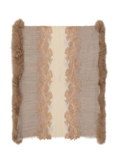 Defined by delicate contrasts, Lane’s lace shawl features a soft merino wool and cashmere base framed with lush fox fur edges. Intricate floral lace panels cascade through the centre, bringing romantic texture and warmth—an elegant layering piece for refined winter moments.