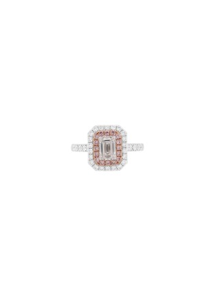 Crafted in 18K white gold, this timeless ring features a classic emerald-cut diamond at its centre, beautifully framed by a delicate pink diamond halo and an outer halo of white diamonds. The diamond-encrusted band adds extra brilliance, while the soft pop of pink offers a unique, feminine touch.