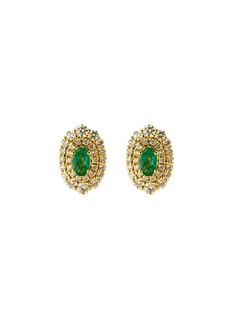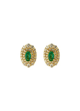 Timeless with a touch of grandeur, these stud earrings centre vivid emeralds embraced by a double halo of brilliant diamonds. Crafted in polished 18K yellow gold, the layered silhouette delivers luminous depth, ideal for refined evenings or elevating classic day looks.
