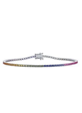 A fluid ribbon of colour, this 14K white gold bracelet traces the wrist with a seamless gradient of sapphires punctuated by ruby accents. Refined yet expressive, it brings a vibrant, contemporary lift to everyday looks or evening ensembles.