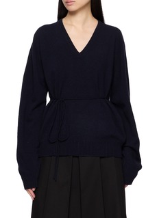 LE17SEPTEMBRE 极简主义版型和创意富有层次感的细节,实现舒适和平衡。这款羊绒混纺毛衣以软糯质感兼顾舒适与格调,V 领衬出肩颈线条,抽绳收腰可自由调节廓形,宽松袖型搭百褶裙显松弛,是日常单穿、叠搭都适配的实用款。