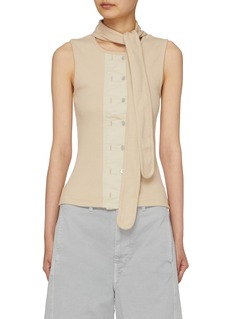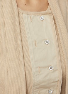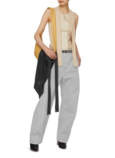LEMAIRE 继续探索解构与重组的可能性,通过错落有致的层次感与建筑般的立体裁剪,呈现摩登都会美学。这款上衣采用棉衬里罗纹针织面料制作而成,面料轻盈飘逸,罗纹纹理增添了质感。双扣门襟配以珍珠母纽扣,颈巾设计带来造型流动感。