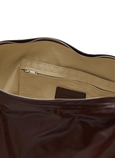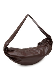 LEMAIRE 这一牛角包版本采用柔软顺滑的纸感皮革制成,在光线下带有细腻光泽,包身呈自然垂坠感,肩带两端打结细节增添随性韵味。