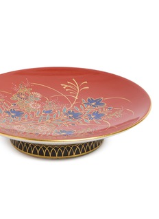 Featuring a rich red background, it is adorned with intricate golden and blue floral patterns that capture the eye and elevate any dining occasion. The plate rests on a delicately crafted foot, detailed with a golden lattice pattern that enhances its elegance and stability. Ideal for showcasing your culinary creations or as a decorative centerpiece, this plate is a celebration of both art and function.