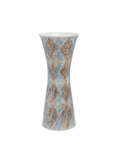 This striking ceramic vase features a dramatic hourglass silhouette adorned with an intricate diamond lattice pattern, crafted using the technique of kinrade. The hand-painted geometric design creates mesmerizing visual depth through subtle glaze variations and organic speckled textures. This piece is ideal for contemporary floral displays or as an elegant standalone art object that elevates any refined interior.