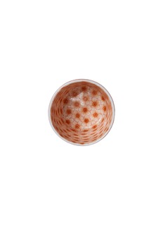 This charming ceramic cup features a delightful array of floral and heart patterns in a rich terracotta hue, segmented by a crisp white band adorned with a delicate bow design. The playful yet sophisticated patterns wrap around the cup, offering visual intrigue from every angle.
