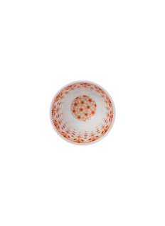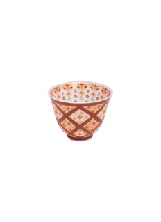 This elegant ceramic cup is adorned with a captivating pattern in a soothing terracotta hue, featuring a harmonious blend of diamond shapes and floral motifs. The intricate design is framed by a delicate lace-like rim, adding a refined touch to its overall appearance.
