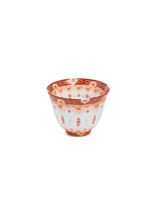 This delightful ceramic cup features a graceful floral pattern in a soft coral hue, expertly contrasted against a crisp white background. The delicate interconnected floral motifs create a sense of harmony and calm, ideal for peaceful tea or coffee moments.