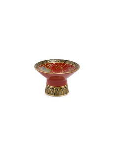 This striking footed plate exemplifies the refined Japanese artistry, featuring a graceful pedestal design that elevates both form and presentation. It showcases a luxurious rust-red glaze adorned with delicate hand-painted botanical motifs, creating a captivating visual harmony. The rim and foot are embellished with intricate geometric patterns in burnished gold, adding a sophisticated architectural element.