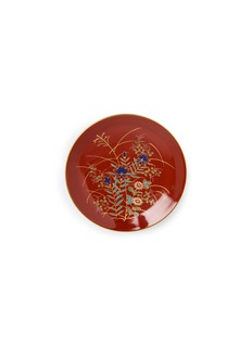 This striking footed plate exemplifies the refined Japanese artistry, featuring a graceful design that elevates both form and presentation. It showcases a luxurious rust-red glaze adorned with delicate hand-painted botanical motifs, creating a captivating visual harmony. The rim and foot are embellished with intricate geometric patterns in burnished gold, adding a sophisticated architectural element.