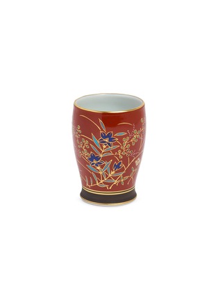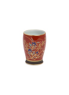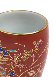 This exquisite glazed ceramic cup exemplifies traditional Japanese craftsmanship, featuring a rich rust-red exterior adorned with intricate hand-painted botanical motifs. The delicate floral designs cascade gracefully across the surface, while a pristine interior provides elegant contrast, making it ideal for tea ceremonies or as a collectible decorative piece.