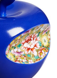雕塑家李立宏深受家乡江西景德镇瓷文化的影响,以传统陶艺为载体、融入中西合璧元素,表达对当代社会状态的理解。被咬了一口的苹果造型灵感源自广为人知的苹果公司标志,设计师为其搭配了中国古典的五彩花卉纹饰,东西方文化特色达到艺术上的完美结合,形成视觉上的冲击,更引发思考,是蕴含文化内涵的收藏品。