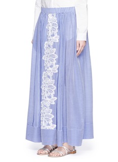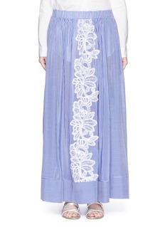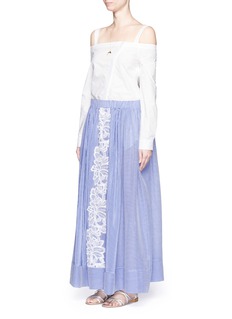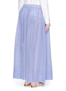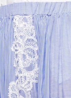 在女儿Eugénie的鼓励下,热爱旅游的Louisa Marangou Zembyla创立了度假服饰品牌Lila Eugénie,以精美细节、中性色调演绎休闲新风尚。这款半身裙以棉混真丝面料塑造轻巧透薄的质感,蓝白配色条纹设计清新怡人,中央加入白色钩花图案,更添优雅甜美。