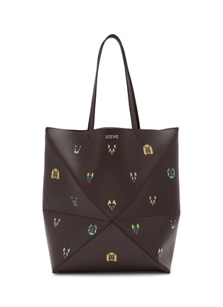 LOEWE's structured tote celebrates the house's whimsical charm with playful enamel dog motifs scattered across its clean-lined silhouette. Geometric paneling adds architectural dimension, while dual shoulder straps offer effortless carry. The spacious design balances everyday functionality with the Spanish maison's distinctive artisanal character.