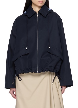 Lightweight yet architectural, this parka from LOEWE is crafted in cotton and silk gabardine for a fluid drape with subtle sheen. A detachable hood and split back reveal contrast check lining, while the gathered hem refines its volume—layer it over soft tailoring for elevated utility.