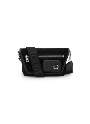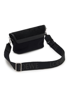 LOEWE's crossbody bag features a zip-top closure, embossed front patch pocket with D-ring detail, and logo-jacquard adjustable strap. The compact silhouette includes multiple organizational pockets for everyday essentials. A sophisticated hands-free style that combines functional design with understated luxury.