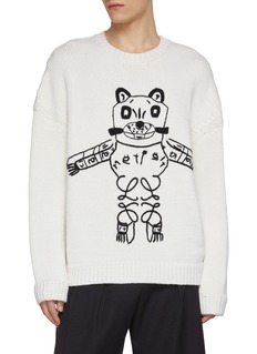 Wool warmth meets LOEWE’s whimsical artistry in this hand-embroidered sweater, depicting a large Lucky Cat entwined with the house Anagram. Inspired by Louis Wain’s surreal “Futurist Cats,” the piece blends childlike linework with refined craftsmanship, making it a statement knit for elevating simple denim or grounding tailored looks with playful edge.