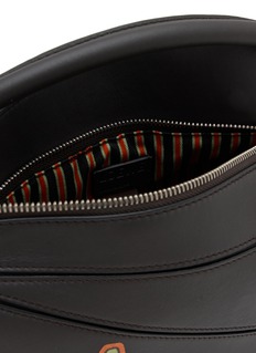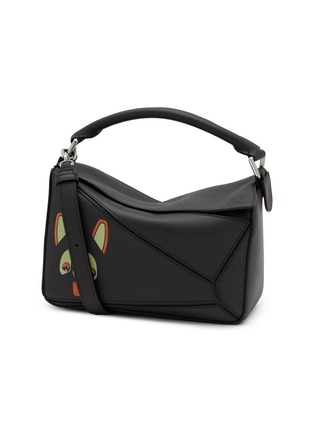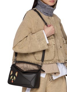 Add a touch of whimsy to your wardrobe with LOEWE’s iconic Puzzle Bag, featuring a charming cat motif in vibrant hues. Crafted in sleek black leather, this playful yet sophisticated accessory combines artistic flair with the brand’s signature geometric design.