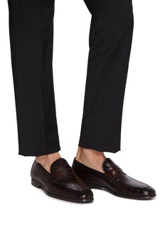 Magnanni's statement penny loafer showcases exceptional Spanish artistry through exotic crocodile-embossed leather and meticulous hand-stitched construction. The refined slip-on silhouette features a classic keeper strap, tonal topstitching, and low stacked heel for sophisticated elegance. A distinguished dress shoe that elevates tailored looks with luxurious texture and Old World craftsmanship.