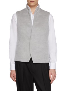 This Magnus & Novus vest is meticulously tailored from pure cashmere, offering a whisper-soft hand feel and refined warmth. Its clean, collarless silhouette with concealed closure speaks to minimalist sophistication—perfect for layering over crisp shirting or fine knits.