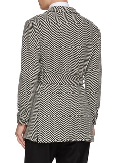 Woven from pure wool, this Magnus & Novus coat features a striking monochrome herringbone pattern that merges classic tailoring with sculptural finesse. The belted silhouette and peak lapels refine its architectural lines, making it a statement of confident modern elegance.