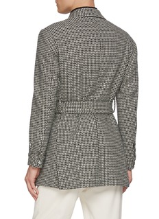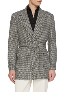 This Magnus & Novus coat reinterprets classic tailoring with a bold monochrome herringbone motif. Crafted from pure wool, its structured silhouette is softened by a self-tie belt, blending masculine precision with relaxed refinement—ideal for transitional dressing with modern edge.