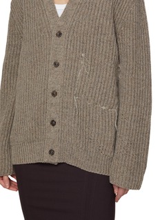 Maison Margiela reimagines the classic cardigan through raw textures and subtle deconstruction. Knitted with a dense rib for sculptural weight, the relaxed silhouette features a deep V-neckline and visible stitch traces — signatures of quiet rebellion. Pair with crisp shirting or layered knits for contrast.