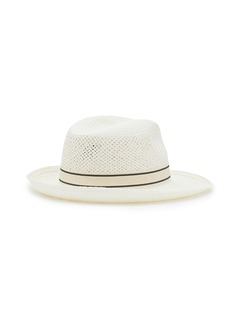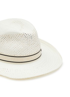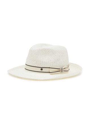 Maison Michel 这款宽檐帽廓形简约大方,蝴蝶结饰拼色条纹帽带为单品带来精致细节变奏,结合白色稻草材质更显清新自然,瞬间提升造型的摩登指数。