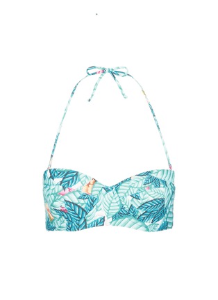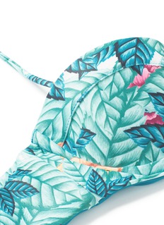 Mara Hoffman常以大自然元素为设计灵感,呈现出亲切素雅的格调。这款文胸式泳衣布满叶纹印花,隐约透出白色及粉红色的花卉图案,附胸垫及金属承托设计突显优美的身材,采用具有SPF 50+防晒系数的再生尼龙面料,适当地呵护您的肤肤,让您安心投入水上乐趣当中。