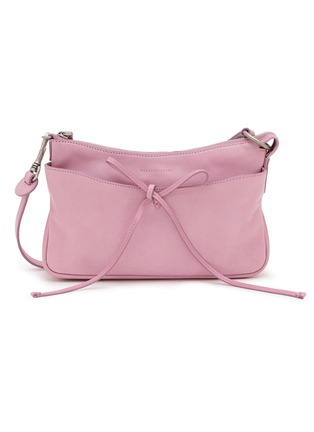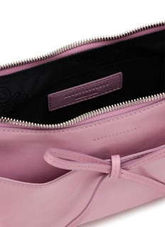 Sculptural simplicity meets functional elegance in this leather pochette, its tied ribbon closure adding a playful, artistic touch. The sleek silhouette and detachable strap make it a versatile statement for modern sophistication.
