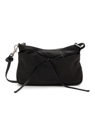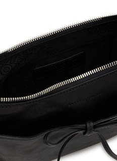Sculptural simplicity meets functional elegance in this leather pochette, its tied ribbon closure adding a playful, artistic touch. The sleek silhouette and detachable strap make it a versatile statement for modern sophistication.