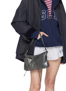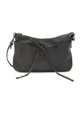 Sculptural simplicity meets functional elegance in this leather pochette, its tied ribbon closure adding a playful, artistic touch. The sleek silhouette and detachable strap make it a versatile statement for modern sophistication.