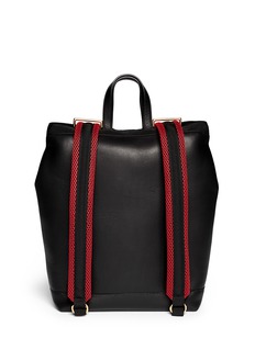 玛尼的皮革包袋以高质用料及精细做工而深受时尚人士喜爱,这款背包款式简约百搭,容量充足,肩带以红色网眼布拼贴,与优雅大气的黑色羊皮相映成趣,风格各异却又配合得恰到好处,为您的出门造型增添时尚玩味。