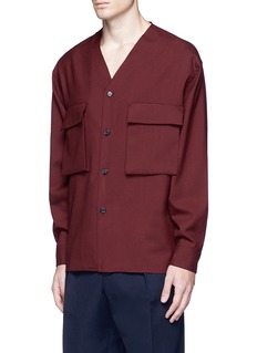 玛尼以独特细节重塑衬衫款式,这款以不包边V领设计取代传统的翻领,配以优雅的酒红色主调,散发出复古韵味,结合两个立体剪裁的胸袋,让您的造型更显别致。