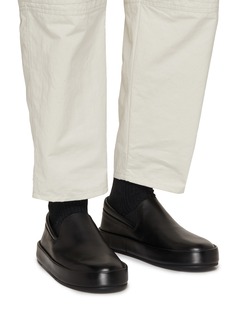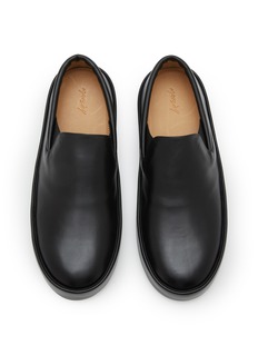 Marsèll 以形态、色彩和纹理特色的无缝融合为亮点。这款便鞋采用细腻光滑的真皮勾勒出流畅版型,黑色调感觉深邃摩登,助你轻松打造颇具慵懒魅力的时尚造型。
