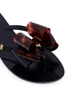 Melissa甜美而实穿的鞋履受到不少时尚女生的青睐,这款利用防水的PVC材质打造,黑色主调搭配鞋头黑色和豹纹蝴蝶结装饰散发甜蜜又神秘的气息,夹脚款式休闲舒适,为春夏造型增添亮丽姿彩。