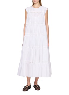 Bands of airy lace insets and softly gathered tiers define this cap-sleeve maxi dress, revealing Merlette’s signature weightless movement. Its luminous white palette and elongated silhouette offer an easy, serene refinement—equally suited to warm city days or coastal escapes.