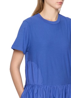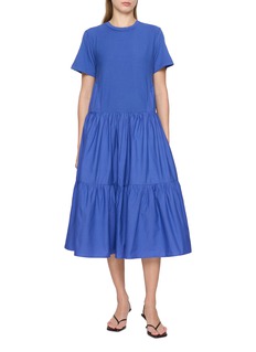 A study in easy movement, this tiered dress reflects Merlette’s signature interplay of softness and structure. The crisp cotton jersey bodice meets a gathered skirt in matching tone, creating a relaxed yet thoughtfully contoured silhouette ideal for everyday dressing or effortless weekend style.