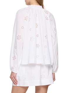 Soft gathers fall from a gently ruffled collar in this eyelet-detailed top, reflecting Merlette’s signature blend of delicacy and ease. Its airy silhouette and circular cutwork motifs introduce a subtle romance, ideal for warm-weather layers or refined everyday dressing.