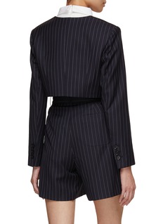 Ming Ma 以“An Instinct for Surprise”为理念,运用立体剪裁及垂褶细节打造富雕塑感的服饰,凸显现代女性的优雅魅力。这款西服外套凭借流畅剪裁勾勒率性短款版型,蕾丝荷叶边缀饰更为方正版型带来俏皮活力点缀。