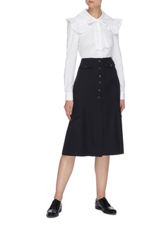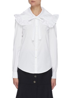 MING MA这款上衣以颇具可爱学院风的蝴蝶结与褶裥衣领点亮设计,纯白色调感觉干净清爽,助你打造俏丽动人的淑女造型。