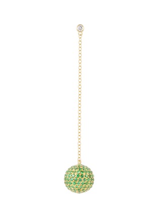 The sweetness of MIO HARUTAKA's Bonbon Earring is beautifully captured, offering a playful yet timeless design. Resembling a glistening hard candy, a perfect sphere encrusted with green garnets dangles on a delicate chain hanging from a diamond stud at the lobe. This piece is meticulously crafted by Japanese artisans, reflects the brand's commitment to beauty and craftsmanship.
