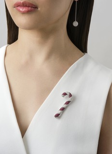 Imbued with yuletide charm, this brooch and pendant exudes festive elegance. A candy cane motif, meticulously fashioned from radiant rubies and pristine white diamonds, swirls harmoniously in a classic holiday symbol. Boasting versatile design, this piece can be adorned as a brooch or dangled playfully at an angle as a pendant necklace.