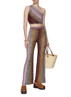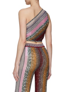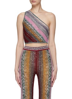 MISSONI 这款上衣凭借利落剪裁勾勒单肩、无袖的短款廓形。亮片缀饰的拼色条纹带来满满吸睛效果的同时亦增添些许品牌辨识度,轻松升级你的摩登时尚造型。
