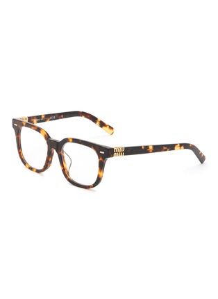 These Miu Miu eyeglasses exude a sophisticated charm with their classic tortoiseshell pattern and bold square frames. The signature gold-tone accents on the temples highlight Miu Miu's keen attention to detail, making these glasses a perfect blend of luxury and style.