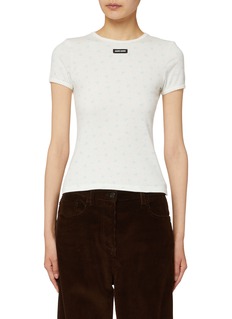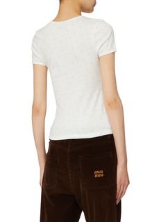 Miu Miu 擅用色彩与细节营造甜酷氛围,风格鲜活而精致。这款 T 恤以清新花卉图案点缀简洁廓形,胸口 logo 徽标细节更添品牌辨识度,融合休闲与精致气息。