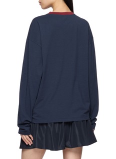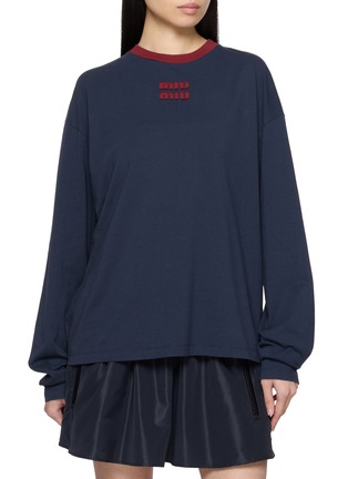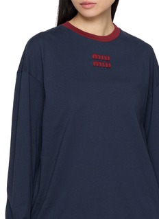 Miu Miu 这款 T 恤以柔软面料为基底,宽松长袖版型是品牌经典的 “慵懒少女感” 语言,撞色领和立体 LOGO 是标志性辨识度细节,适配日常出街、休闲约会等场景。