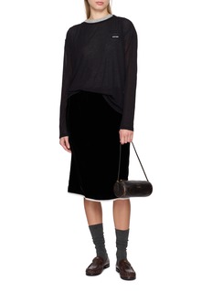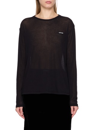 Miu Miu 这款长袖上衣以透视针织打造轻透质感,简约圆领适配叠穿,低调标识点缀品牌调性。色调百搭不挑,搭吊带显层次,配西装添感性氛围,是打造轻熟风造型的点睛单品。