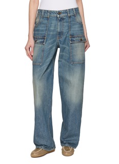 Miu Miu 这款牛仔裤以浅水洗牛仔为基底,直筒版型是品牌经典的 “松弛复古” 语言,工装口袋和做旧纹理是核心细节,适配日常出街、轻复古等场景。
